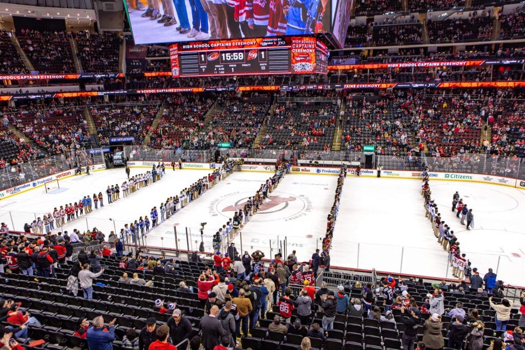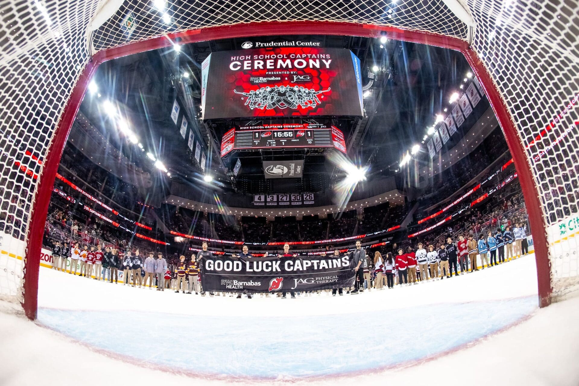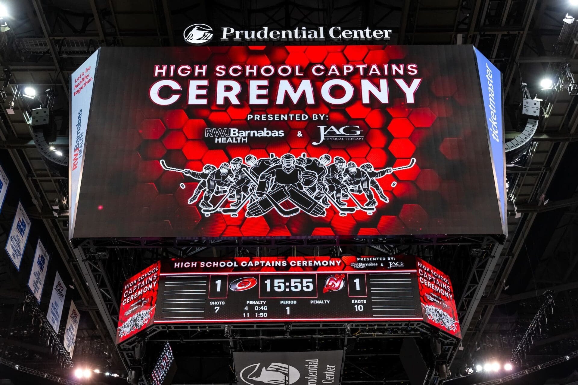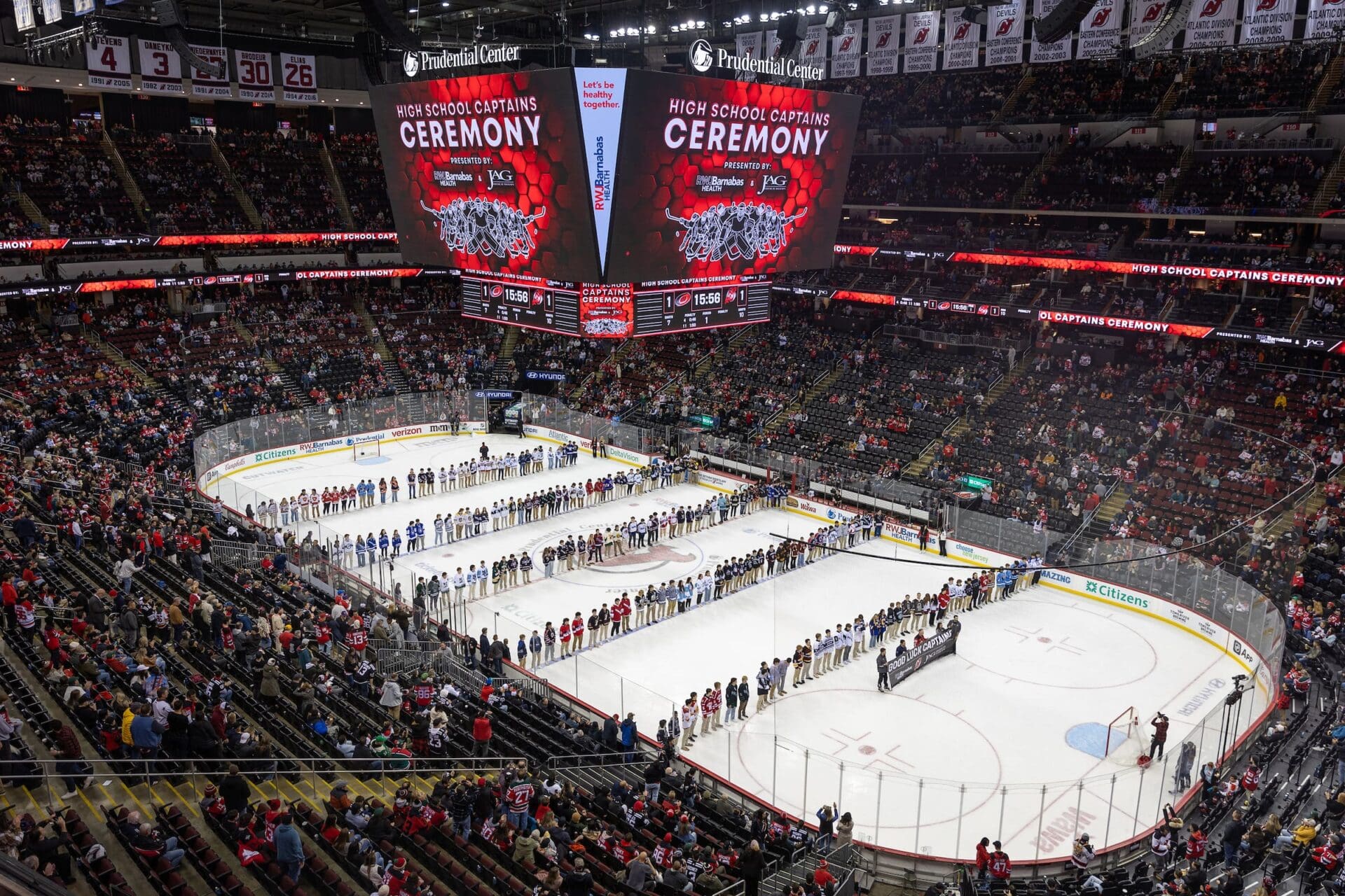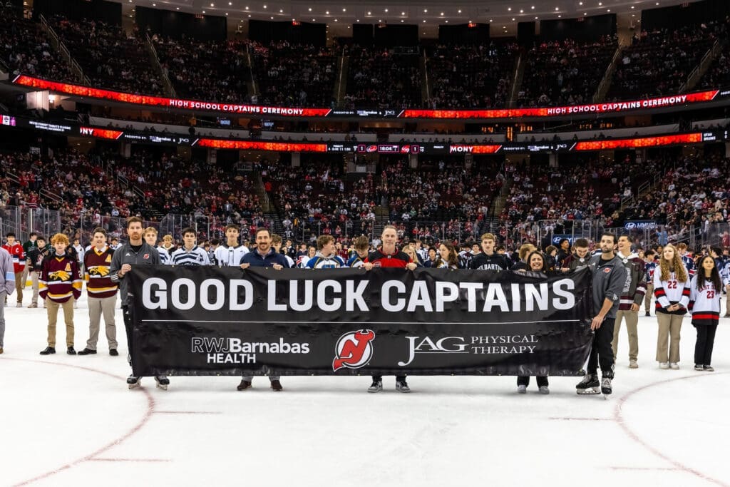 The New Jersey Devils High School Captains Night presented by RWJBarnabas Health and supported by JAG Physical Therapy kicks off the high school hockey season by inviting select captains from each NJ High School Hockey team to the Prudential Center to be honored, on the ice, during the first intermission of the Devils game.